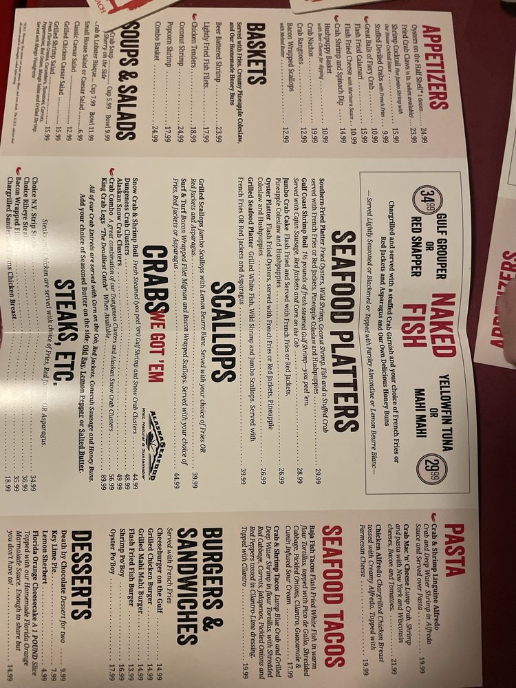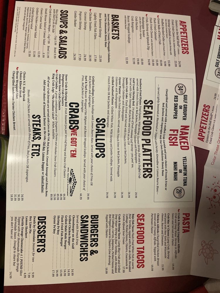Wild shrimp, coconut shrimp, gulf fish, oysters, and a stuffed crab garnish. Served with French fries or boiled potatoes, Pineapple Coleslaw and Hushpuppies.