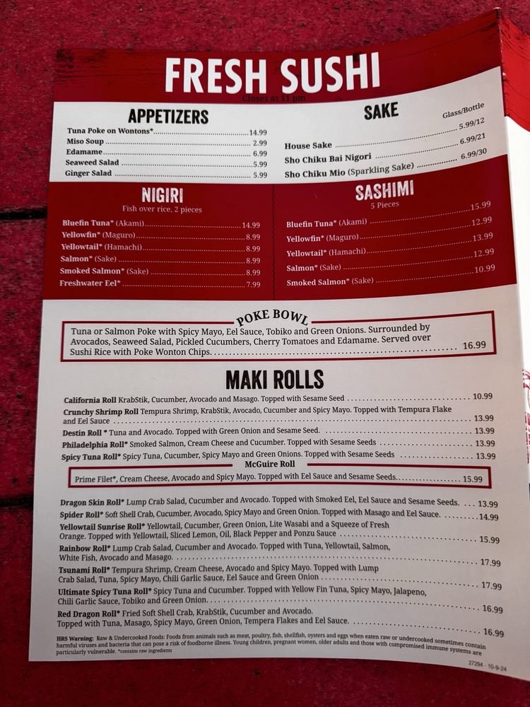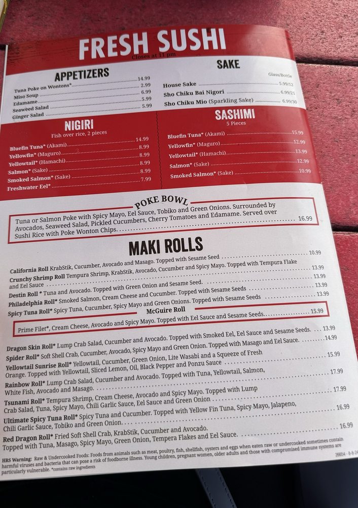 Contains raw ingredients. Raw & Undercooked Foods: Foods from animals such as meat, poultry, fish, shellfish, oysters, and eggs when eaten raw or undercooked sometimes contain harmful viruses and bacteria that can pose a risk of foodborne illness. Young children, pregnant women, older adults, and those with compromised immune systems are particularly vulnerable. Fish over rice, two pieces.